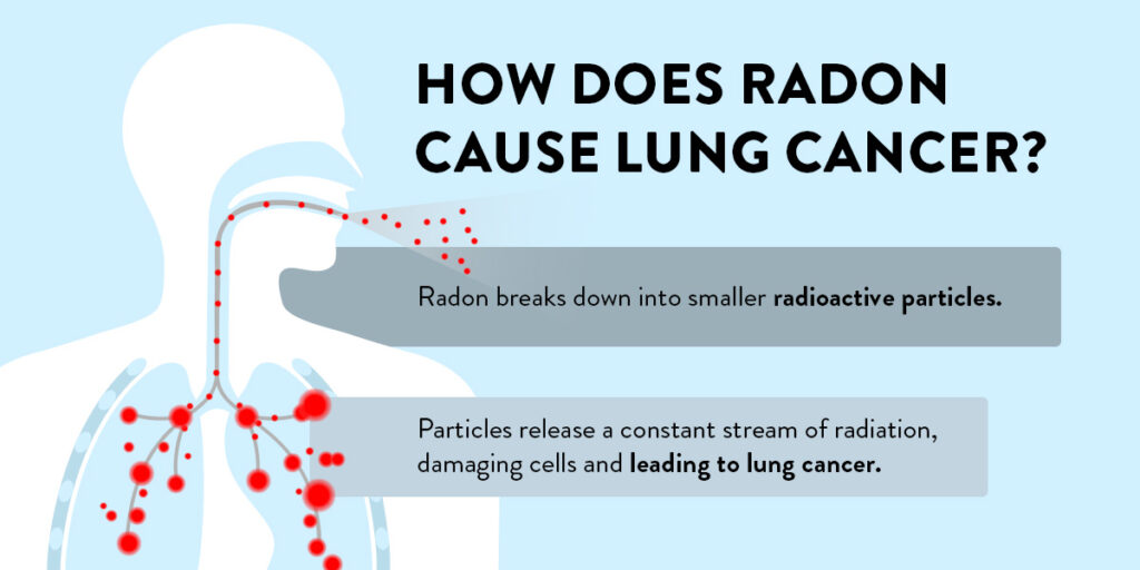 Radon breaks down into smaller radioactive particles. When you inhale radon particles, they can become trapped in the linings of your lungs, where they break down further. As they decompose within your lungs, these radon particles release a constant stream of radiation, damaging cells and leading to lung cancer.
