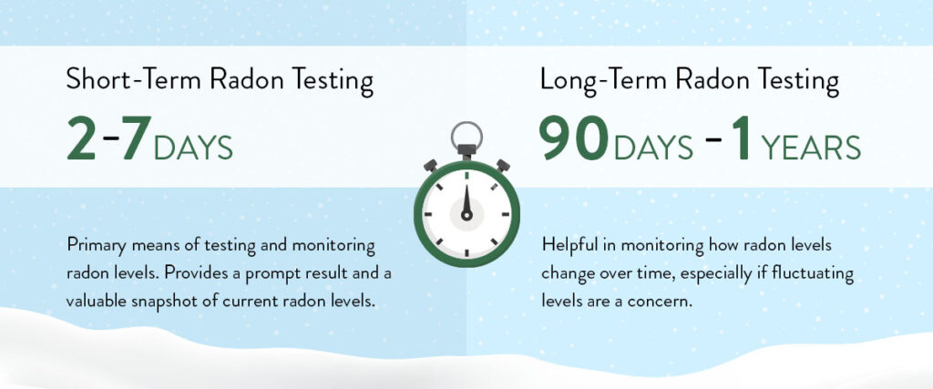 Longer-term test kits stay in the home for a longer time, generally between 90 days and a year. They’re helpful in monitoring how radon levels change over time, especially if fluctuating levels are a concern. If short-term tests show unusual amounts of variation, specialists may suggest using a long-term test kit to better understand the situation.